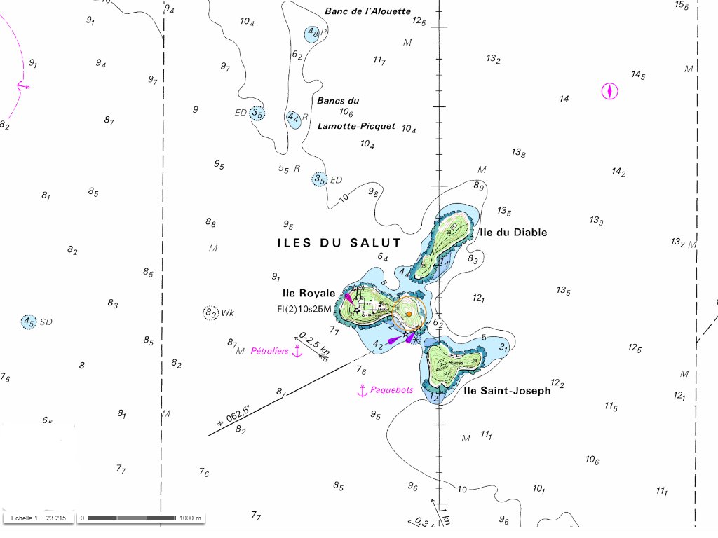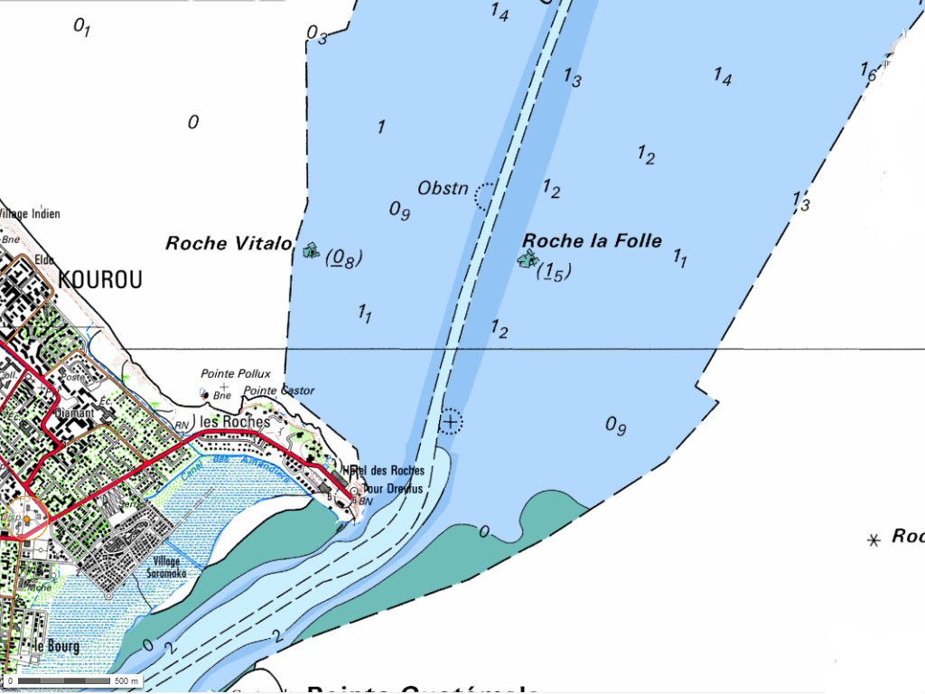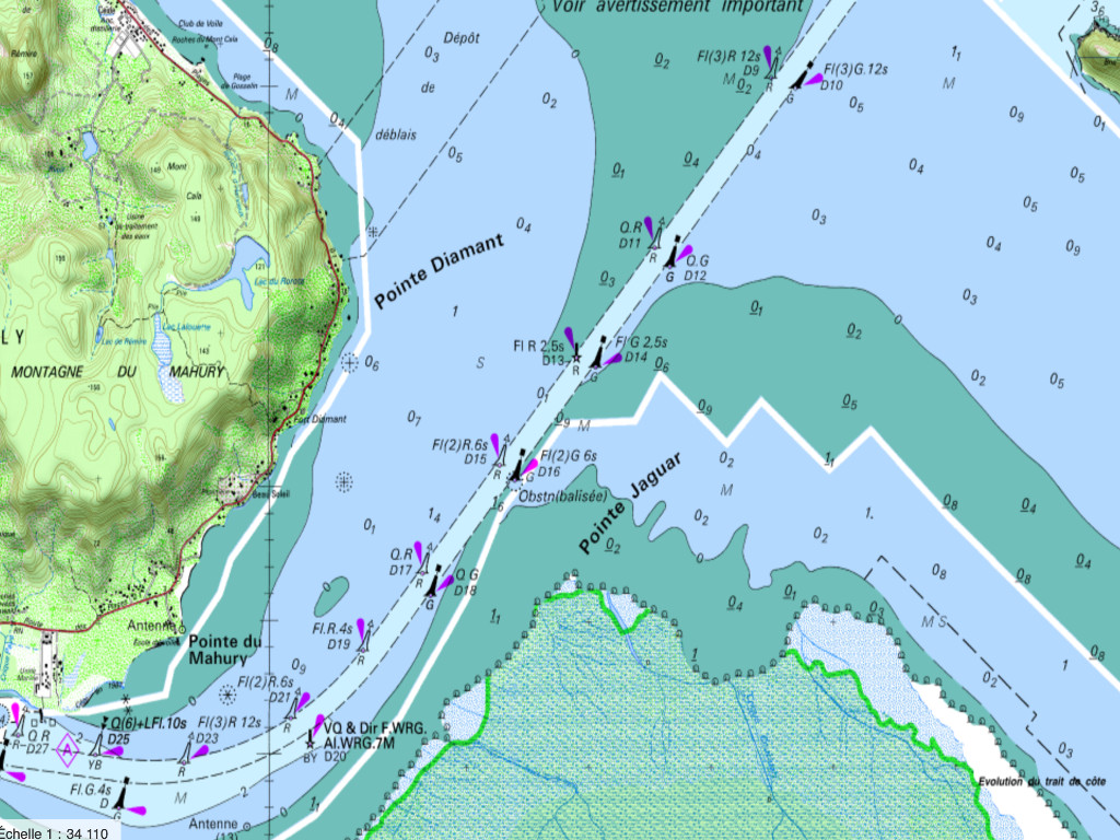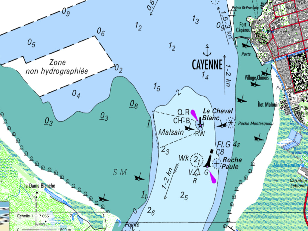 Les cartes marines de Guyane représentent les éléments indispensables à la navigation. En adéquation avec la signalisation maritime, elle permet de se situer et de se diriger. Elle indique essentiellement les sondes et les isobathes, les dangers , la réglementation maritime, la signalisation maritime et les amers.
