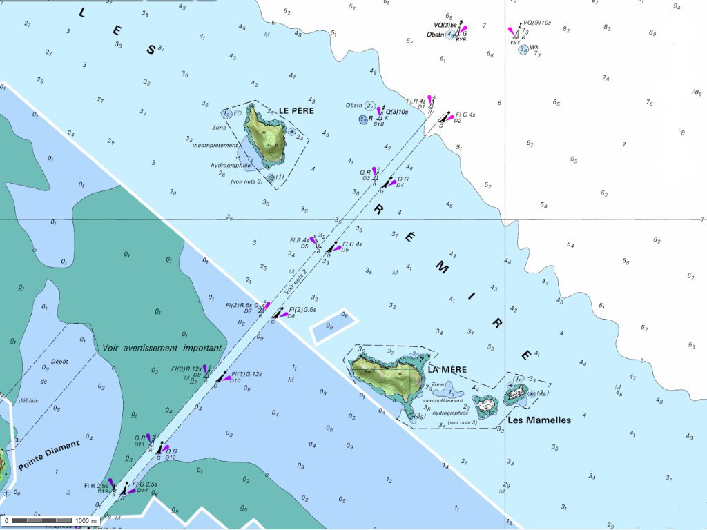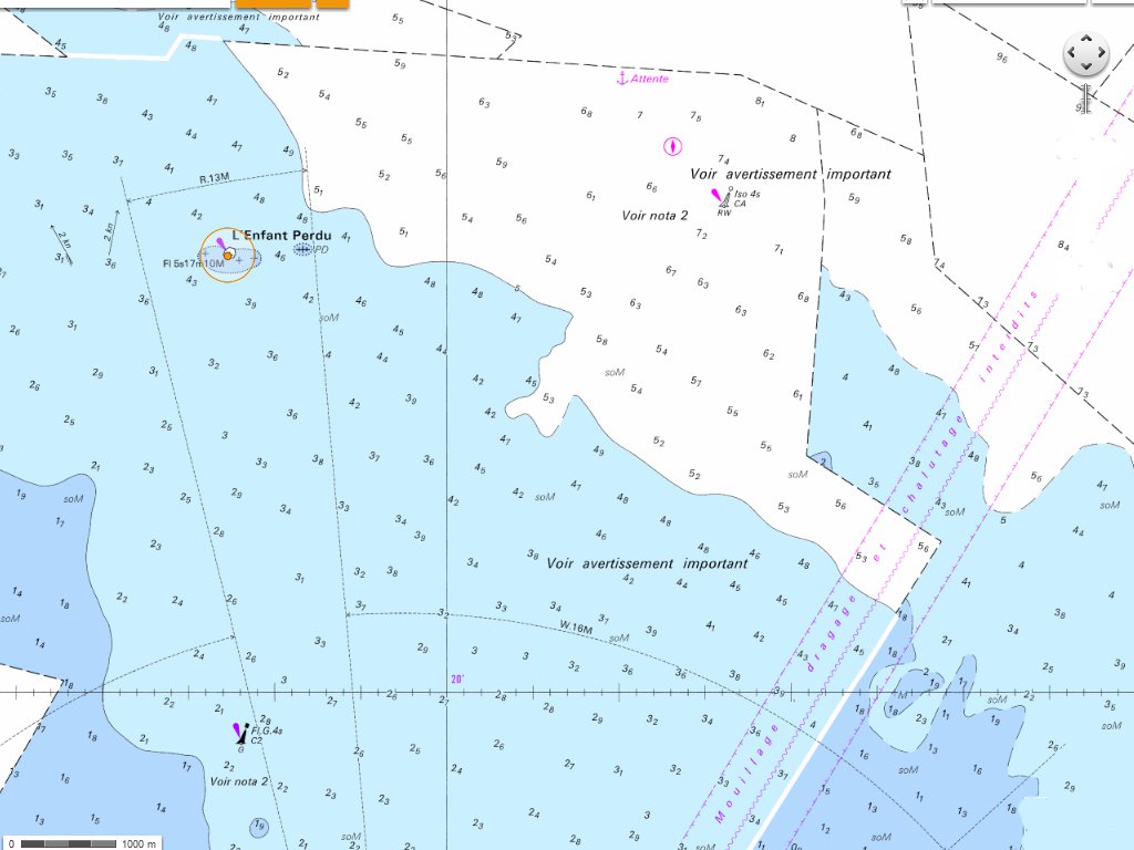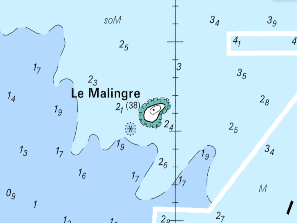Les indications chiffrées des cartes marines sont relatives aux profondeurs et aux altitudes. Certaines roches sont découvertes lors de certaines basses mers et couvertes le reste du temps ! Attention aux chiffres soulignés...