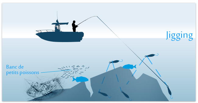 La pêche en jigging consiste à remonter le leurre nommé jig rapidement du fond à la surface de l'eau par à-coups plus ou moins amples.